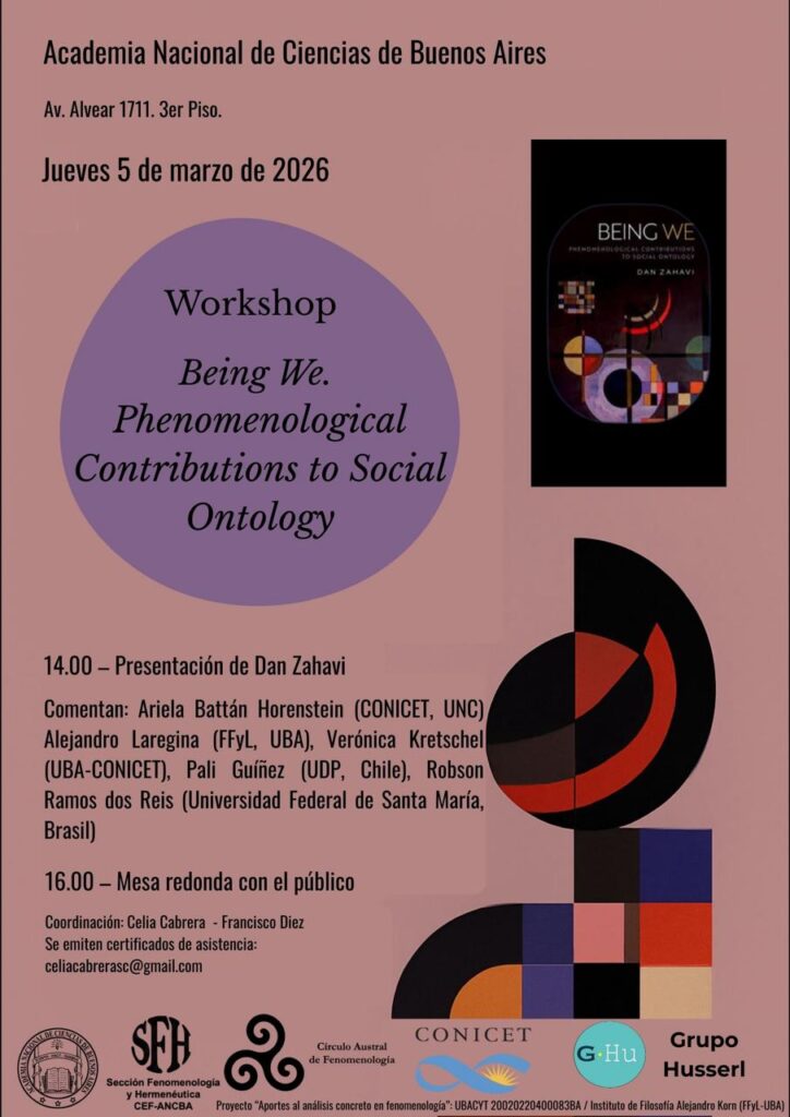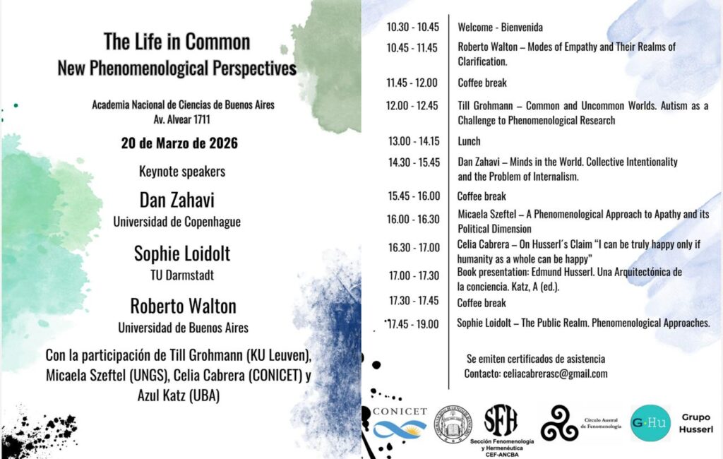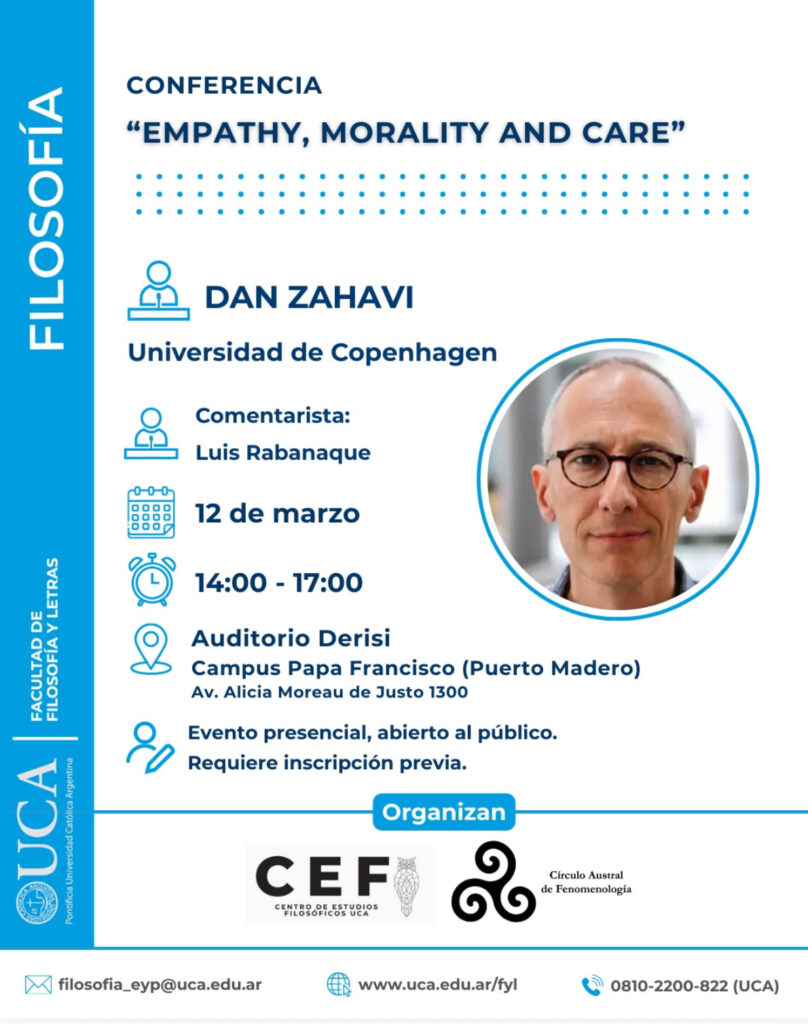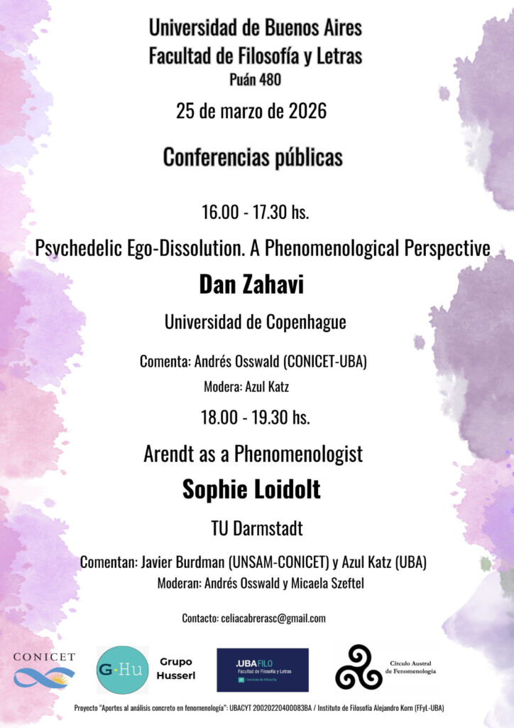 Programación completa de las actividades que durante marzo estáran desarrollando en Buenos Aires Dan Zahavi y Sophie Loidolt. La mayoría de los eventos contará con transmisión. Los enlaces estarán disponibles próximos a la fechas. ¡Estén atentos a las novedades!